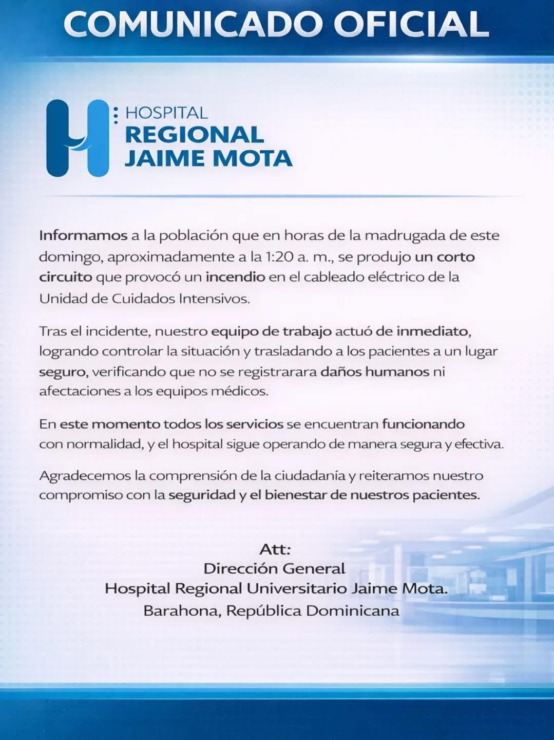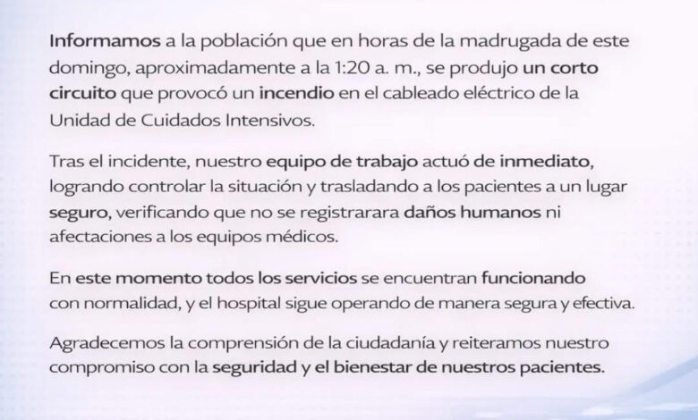 Informamos a la población que en horas de la madrugada de este domingo, aproximadamente a la 1:20 a. m., se produjo un corto circuito que provocó un incendio en el cableado eléctrico de la Unidad de Cuidados Intensivos.
